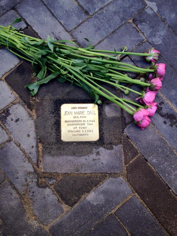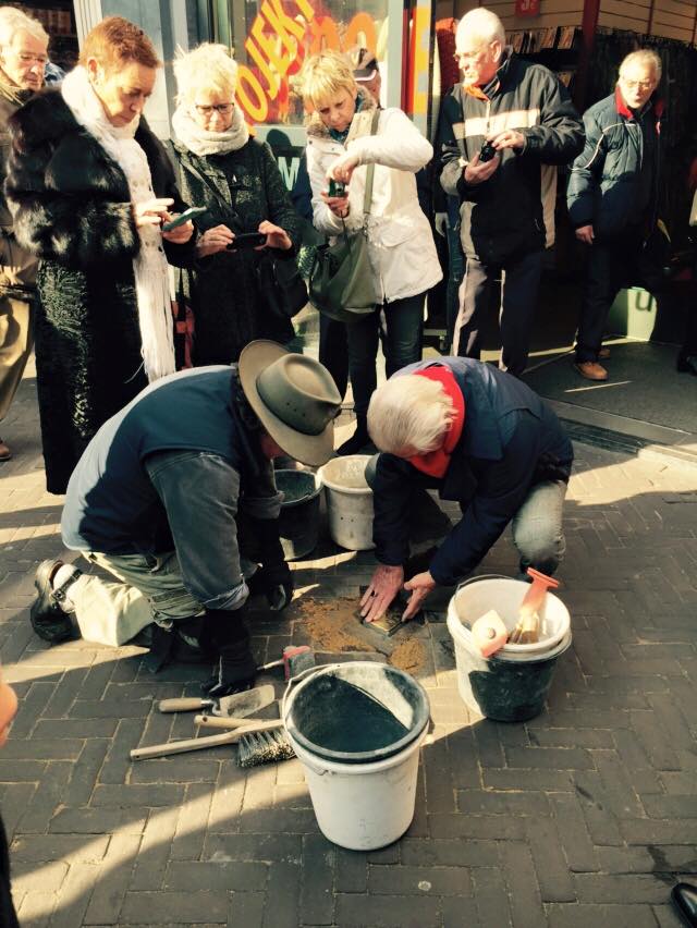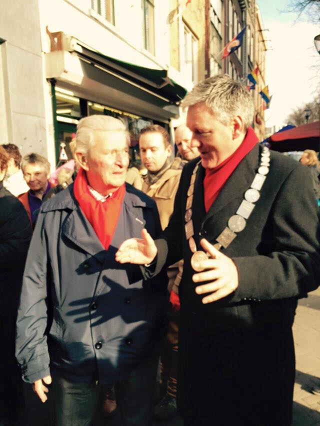 Vastelaoveszoaterdaag. Venlo stroomt vol prachtig uitgedoste mensen. Tussen de winkelende kooptoeristen en verklede feestgangers een klein kringetje mensen. Iemand pinkt een traan weg. Een Duitse meneer met 6 plastic zakken van ‘Die 2 Bruder von Venlo’ tikt op mijn schouder en vraagt of de Prins hier aankomt. Ik vertel dat we een herdenkingssteen leggen voor mijn opa en dat de prins een eindje verderop komt. Hij kijkt me verschrikt aan en zegt: ‘Es tut mir leit.’ ‘Dat hoeft niet meneer, U bent niet de schuld van die oor….’ wil ik zeggen, maar hij was al weg. Buurman bakker Lamberts bij wie opa zich op zolder verschool, komt aanlopen. Hij hugt mijn tante Toos die hij sinds 1955 niet meer gezien heeft en zegt: ‘Ha knoep van mich.’ Jeugdvriendschap roest niet. Een oude dame met een hoofddoekje komt naar me toe en vraagt waar mijn moeder is. Ik zeg voorzichtig dat ze al een poos geleden overleden is. Ze schrikt er gelukkig niet van. Als ze wegloopt draait ze zich om en zegt: ‘Doe haar toch maar de groetjes van me.’ (Ik zal dat zeker doen)